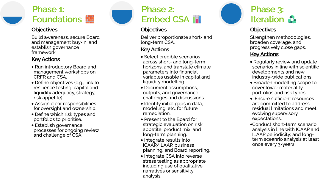 • Document CSA progress within the ICAAP and ILAAP and include a summary of short- and long-term results. • Extend reverse stress testing to encompass CRFR where appropriate, including qualitative or sensitivity analysis. • Present scenarios, limitations, and full outputs to the Board and relevant risk oversight committees, ensuring any required adjustments to risk appetite, CRFR management, or strategy are identified. |