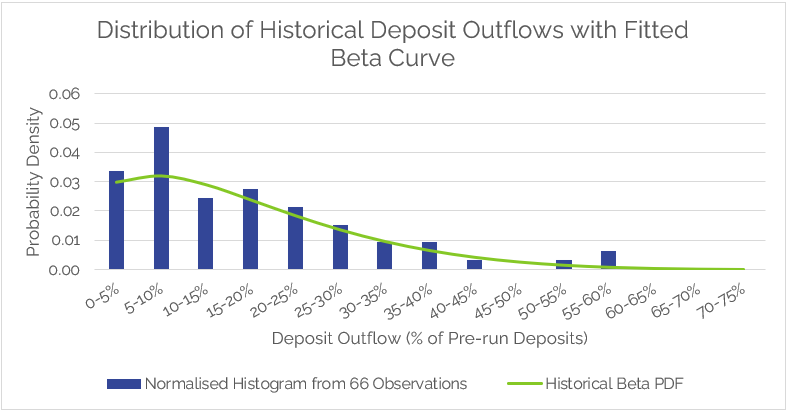 Firstly, we fitted the stressed outflows to a beta distribution. The beta distribution, which gave a good fit, was selected to model the bounded nature of deposit outflows (the possible range of outflows must fall somewhere between 0% and 100%) and to account for skewness, since most runs exhibited high levels of withdrawals, with a few very extreme outliers. [3]