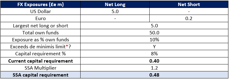 The following table provides an example of the capital requirements achieved by applying the SSA for foreign exchange risk exposures only, and for a firm whose reporting currency is Sterling: many small firms have no trading book positions and market risk only in the form of banking book foreign exchange exposures. For such firms, capital requirements for market risk will increase under the SSA.