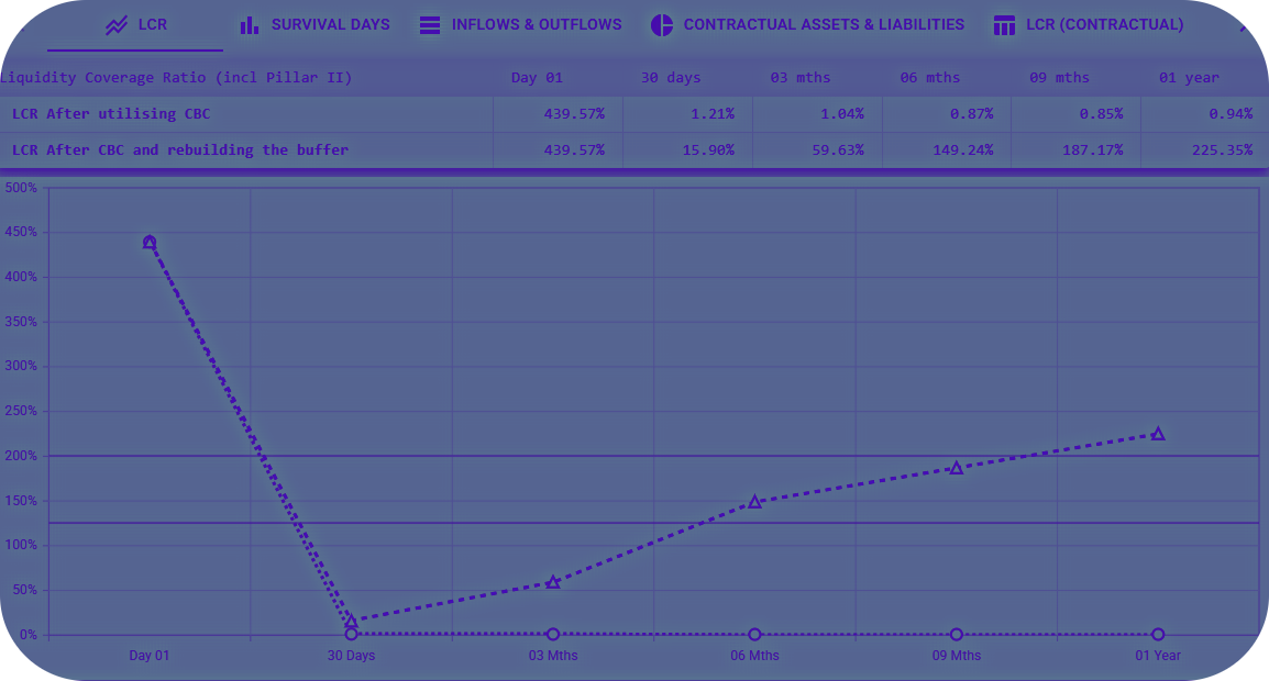 Addresses the growing complexity of liquidity and funding risk management, offering a solution that combines automation, regulatory alignment, and customisation. Simulate stress scenarios; assess compliance with the Overall Liquidity Adequacy Rule (OLAR); evaluate liquidity metrics like the Liquidity Coverage Ratio (LCR) and Net Stable Funding Ratio (NSFR); assess survival days; and make informed decisions during liquidity challenges.